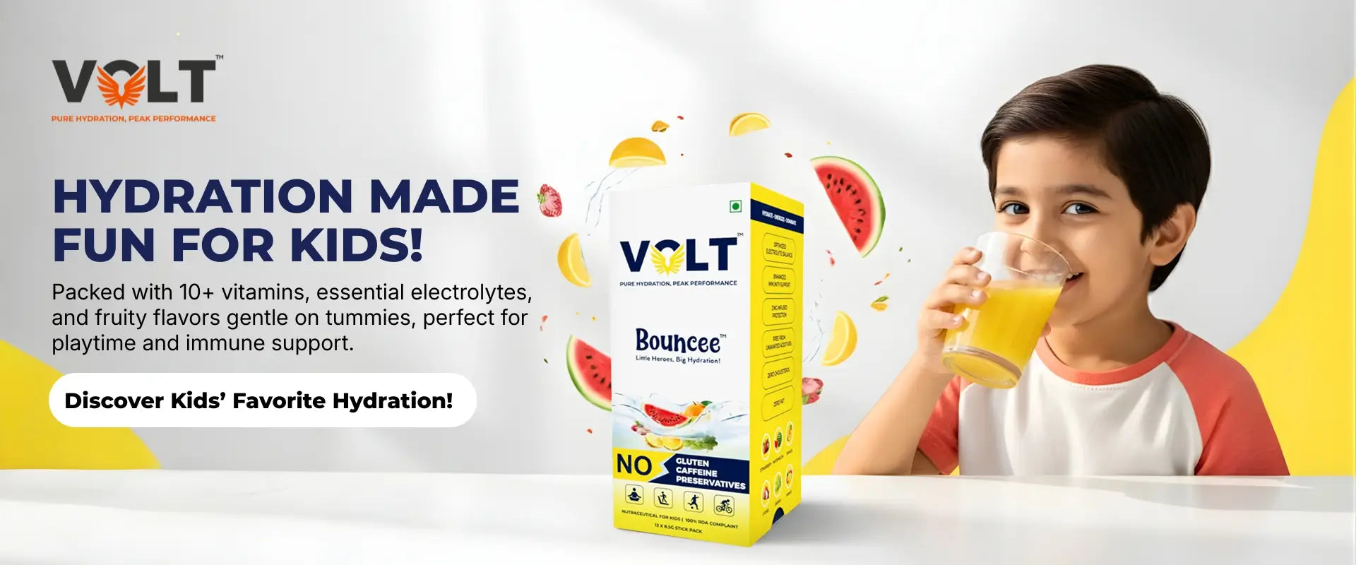 Volt Bouncee Kids – Tummy-Friendly Electrolyte Hydration with 10+ Vitamins | Preservative-Free (12 Sachets)